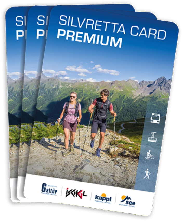 Bei einem Sommeraufenthalt erhalten Sie außerdem die Silvretta Premium Card. Mit dieser Karte genießen Sie kostenlosen Zugang zu Seilbahnen, regionalen Bussen, Bergseen und vielem mehr – im gesamten Paznauntal.
